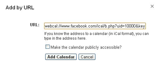 6. Paste the Facebook export URL in the pop up and click “Add Calendar”.