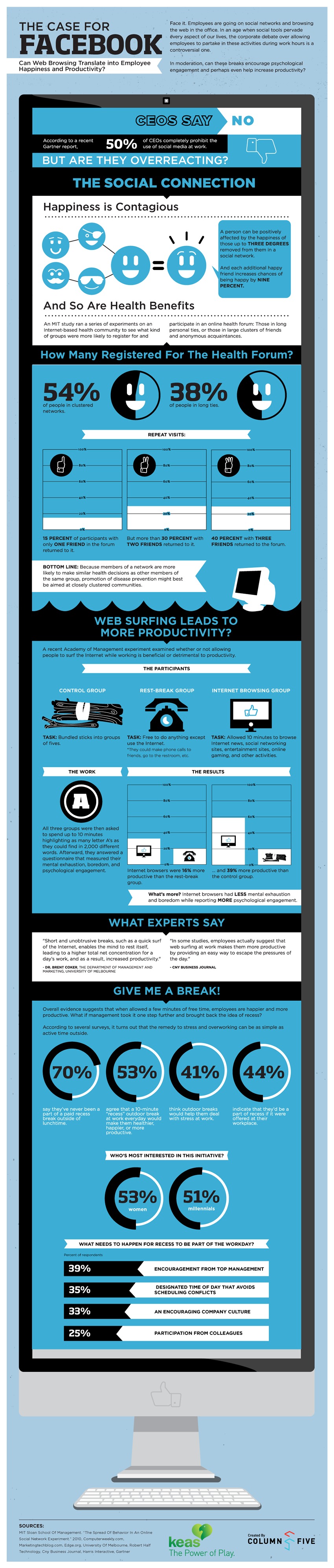 Who said browsing the social media during the work will affect the productivity? According to the experiment by An Academy of Management, browsing the social media during the work; actually increases the productivity. The Keas Infographic explores the benefits of social media in the workplace. According to them, browsing the social media makes the employees feel happier and provides a brief break; thus intern helps to increase the productivity.
