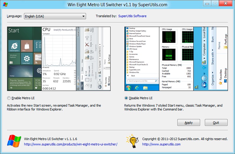 Windows 8 Metro UI Switcher is a free utility that can be download from SuperUtils.com. The utility allows you to disable the windows 8 Start Screen and bring back the old windows 7 styled Start menu. The utility also helps you to switch back to old Task Manager and traditional windows explorer. The utility works on both 32bit and 64 bit versions and doesn’t require any administrator privileges.