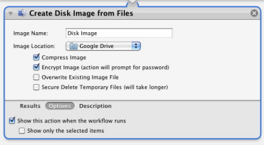 Run the Automator tool and create a new application workflow. Select File -> Import Actions, navigate to the Create disk image from files and click import. You have to drag this action into the workflow area. Choose the image Location as Google Drive folder. You need to enable the encryption options by clicking the Options button. The image will be compressed into a zip archive and protected with a password. Clicking “Ok” after entering the password, will encrypt the disk image. Now share the password with the party you like to share the data. The tool can also work with Dropbox.