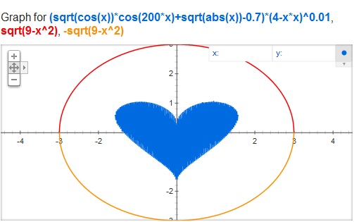 (sqrt(cos(x))*cos(200x)+sqrt(abs(x))-0.7)*(4-x*x)^0.01, sqrt(9-x^2), -sqrt(9-x^2) from -4.5 to 4.5