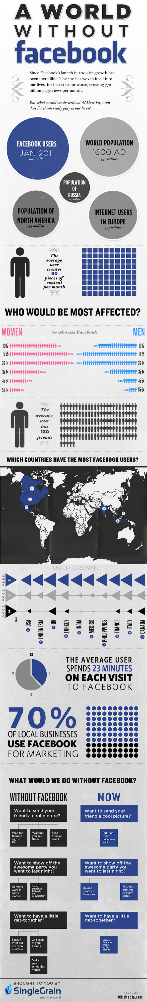 Could you imagine a world without a Facebook? I recently came across an interesting Infographics about Facebook, that says how much we are addicted to this social networking giant. These days the internet is dominated with too many social networking sites, but still Facebook leads the market. Facebook, since its launch in the year 2004, its growth has been incredible. The site has woven itself into our lives, not sure whether for good or for worse. But certainly its into our life. But what could we do without it? How big a role does Facebook really play in our lives? Here is the stats from singlegrain.com.