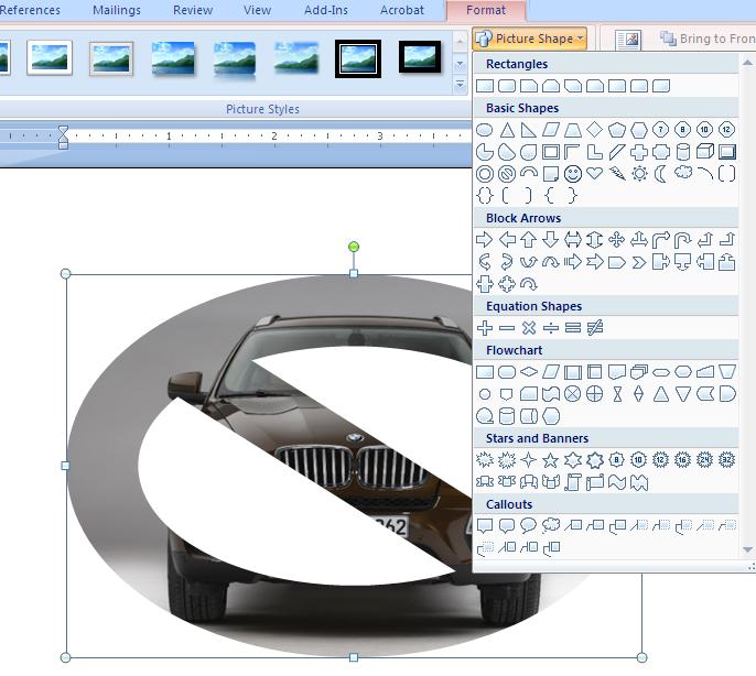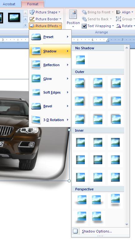 Click on the “Picture Effects” pull down menu from the “Pictures Tool” tab. Here you can find variety of picture effects to choose from – Shadow, 3D effects, Rotation, Presets, Reflection, Soft Edges, Glow, Bevel, Soft Edges.