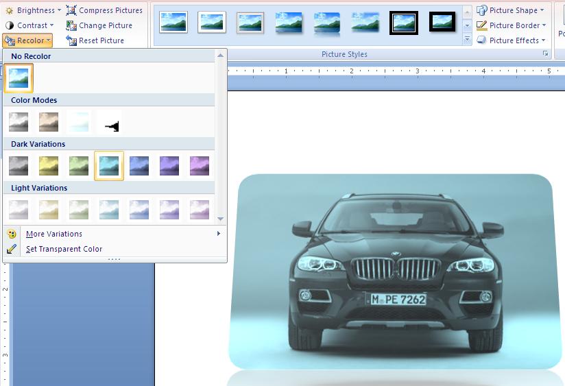 You can improve the image contrast and Brightness by clicking the options on the left corner of the “Picture Tools” tab. You can choose filter kind of effects by choosing “Re-color” option – this feature will let you to recolor the image in different color modes. You can choose from Light and Dark color variations.