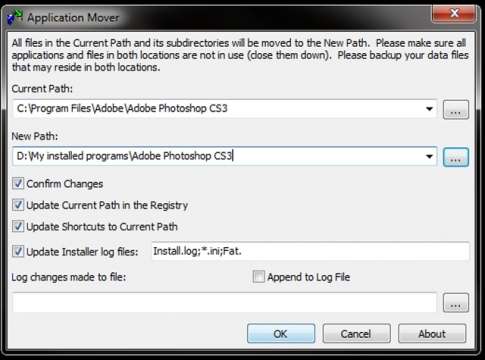 The application moves all the files of the selected application from the “Current path” to the “New path”. The operation is performed in the following order,