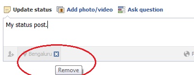 1. While updating your status, move the mouse over the “location”. Facebook will show a remove button.